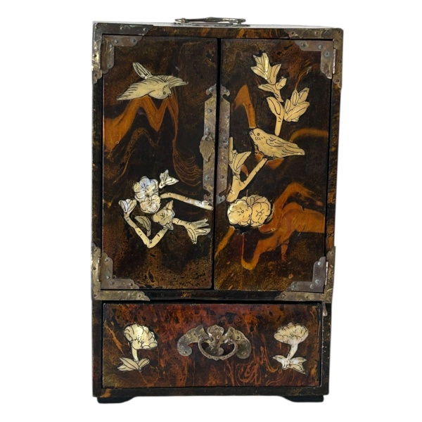 • Antigo móvel porta jóias chinês em madeira incrustada com materiais semelhantes a tartaruga e madre pérola, apresenta 4 gavetas internas e 1 externa com fundo falso, medindo 31x20x15cm.