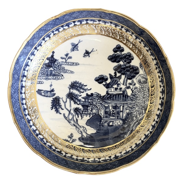 • Prato em porcelana companhia das índias no padrão azul e branco com filetação a ouro, medindo 16cm de diâmetro.
