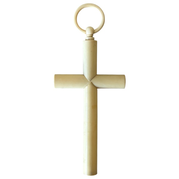 • MARFIM - Antiga cruz de parede em marfim esculpido e torneado, medindo 19cm de altura e 8cm de largura.