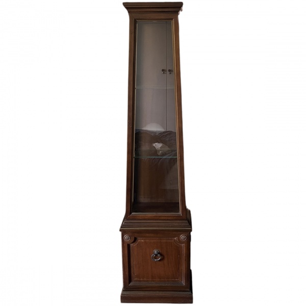 • Vitrine em forma de obelisco em madeira com frisos em ouro velho, possuindo 3 prateleiras internas em vidro (uma com bicado) e porta inferior com puxador em metal, medindo 168 x 42 x 28 cm.