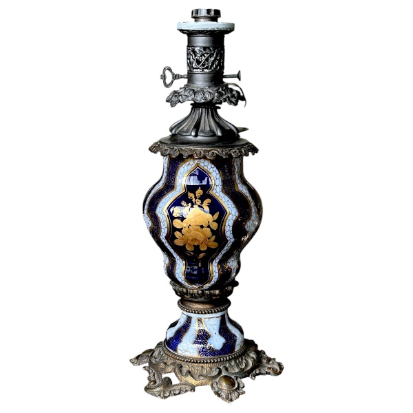 • GOA0067 - Antigo lampião francês em porcelana vieux Paris adaptado para luz elétrica com encaixe para cúpula de abajur com corpo em porcelana nas cores bleu de roi e filetação a ouro, monture em bronze, medindo 52cm de altura e 21cm de largura.A peça tambémém pode ser usada como anfora ou vaso.