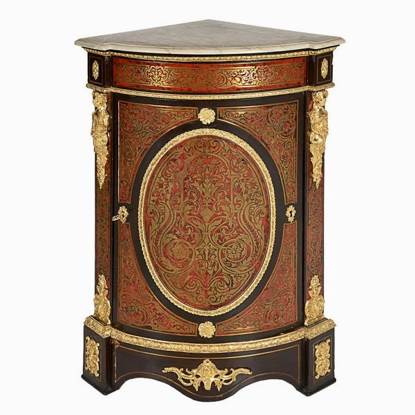 • Belo dunquerque de canto, francês ao gosto de André Charles Boulle construído em madeira ebanizada com placagens em tartaruga loura sob aplicações em bronze cinzelado, apresenta porta anterior abaulada com uma prateleira interna. Riquíssimos adornos em bronze ormolu destacando duas elaboradas cariátides femininas com "bouquets" de flores e guirlandas. Tampo em mármore rajado com frente boleada. Provavelmente século XVIII. Medindo 107cm de altura, 53cm de largura nas laterais e 77cm na parte frontal. Marcas do tempo.