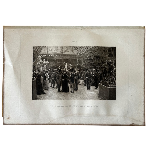 • Antiga gravura não emoldurada representando `un jour de vernissage au palais des champs elysées` por Rixens do salão de arte de 1890, medindo 32x22cm.