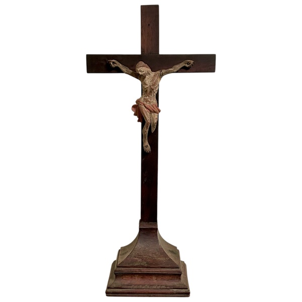 • ARTE SACRA - Antigo cristo de pousar provavelmente mineiro em madeira policromada com belíssima anatomia com características do século XVIII, sobre cruz em jacarandá posterior a sua época, medindo 57cm de altura e 27cm de largura.