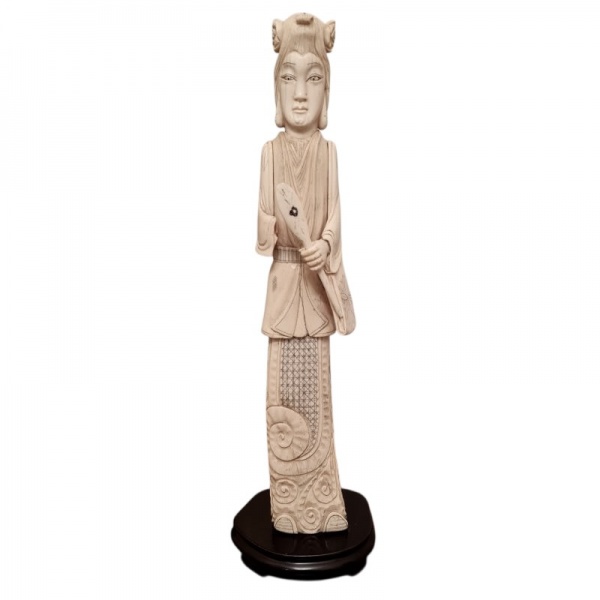 • antiga escultura japonesa em osso finamente esculpido e gravado retratando dama com costumes da época, peça de meados dos anos 1900 em excelente estado de conservação, apresentando apenas a falta de sua mão direita, comum falta em peças desse tipo de material e feitura. Medindo 36cm de altura. Esse lote se encontra em posse do comitente em Minas Gerais e deverá ser enviado preferencialmente via correios.