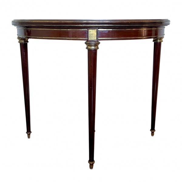 • MOBILIÁRIO - Mesa aparador conversível em mesa em madeira de lei com apliques em bronze e tampo conversível para uso como mesa de 4 lugares, apresenta rasgo no couro original, imperceptível quando fechada. medindo 92x46cm com tampo fechado, 92cm de diametro aberta e  e 75cm de altura.